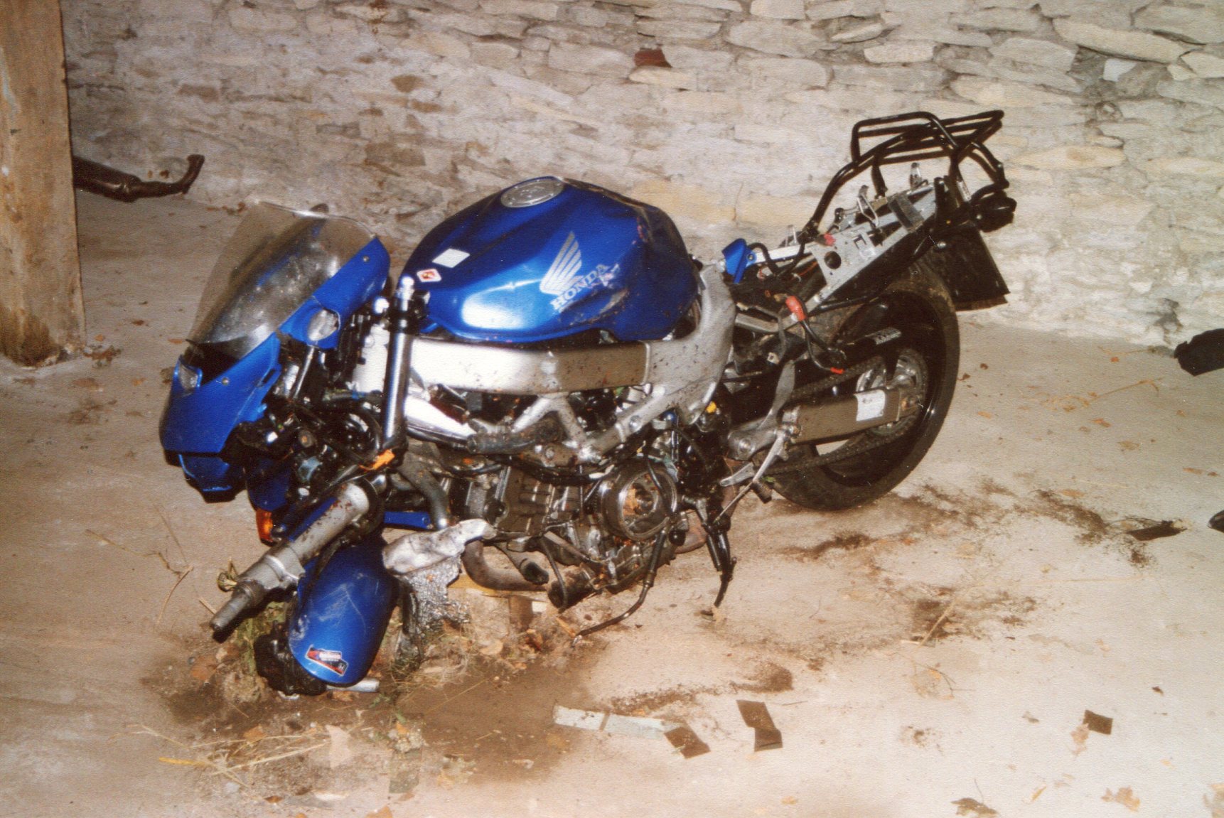 Nur mal so zum gucken. So sah mein Motorrad aus nachdem mich ein bekloppter Raser auf meiner Spur frontal abgeräumt hat. Wie ich ausgesehen habe kann man sich nicht in den kühnsten Träumen vorstellen. Ich zittere immer noch wenn ich diese Bilder sehe.