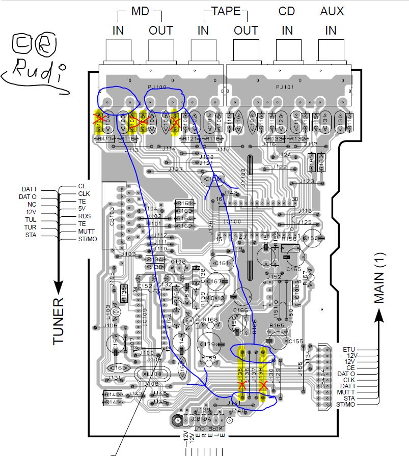 Nach Abnahme des Deckels sieht man die entsprechende Platine, die angepasst werden musste. Leider konnte ich sie obwohl sie auf die Hauptplatine gesteckt war nicht entfernen. Der Stecker war einfach zu fest drin und ich wollte es vermeiden noch irgendwas zu beschädigen. Da man aber an die Brücken und Widerstände ran kam, wenn auch etwas beschwerlich, ging es auch wenn man das Gerät auf die Seite gelegt hat. Die zu lötenden Stellen sind beschriftet wie auf dem Schaltplan.