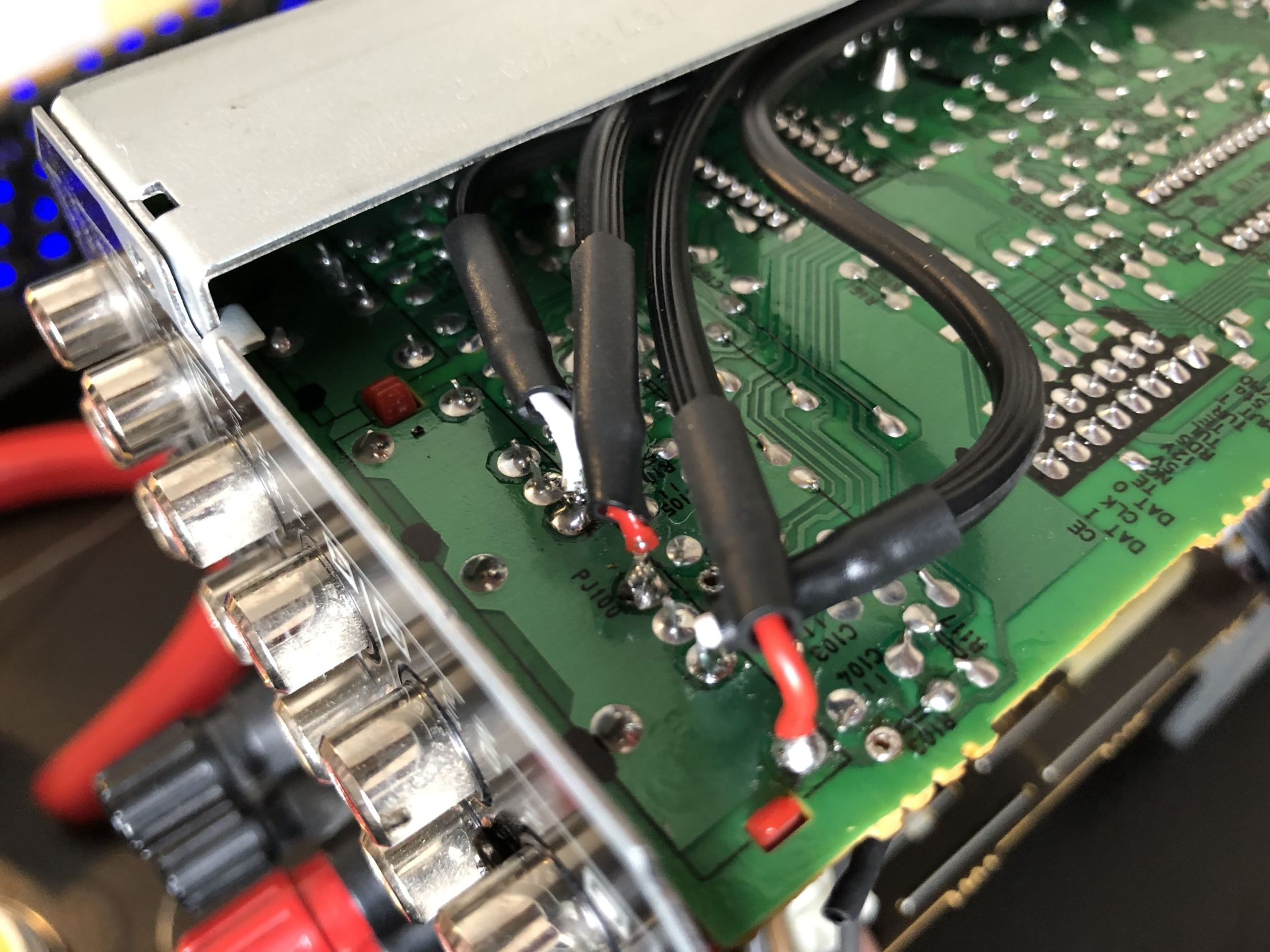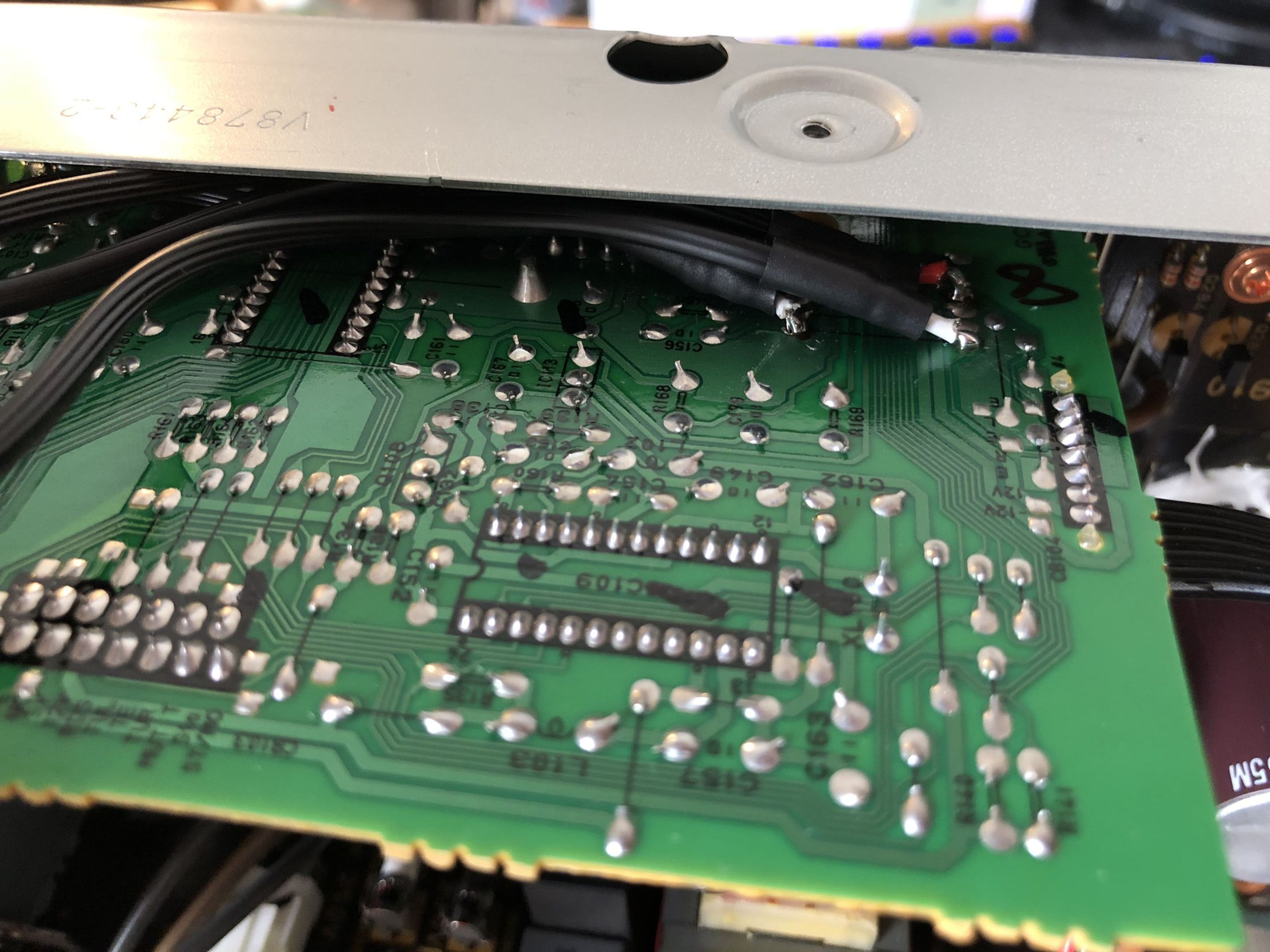 Kabelbrücken eingebaut und verlötet. Es handelte sich um geschirmte Kabel bei denen ein Stück Schrumpfschlauch über die abgeschnittene Schirmung drübergesteckt wurde um einen Kurzschluss zu vermeiden. Der Lötkolben hatte leider eine zu dicke Spitze, daher sieht das Lötergebnis nicht ganz profihaft aus.