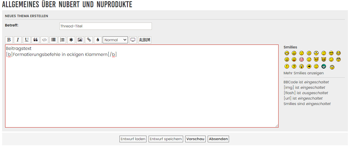 Falls man beim Schreiben eines Beitrags unterbrochen wird oder diesen aus anderen Gründen noch nicht abschicken kann oder möchte, kann man ihn als Entwurf abspeichern und später weiter bearbeiten. Dazu benutzt man am besten die Funktion „Entwurf laden“, nicht „Anzeigen/Ändern“.