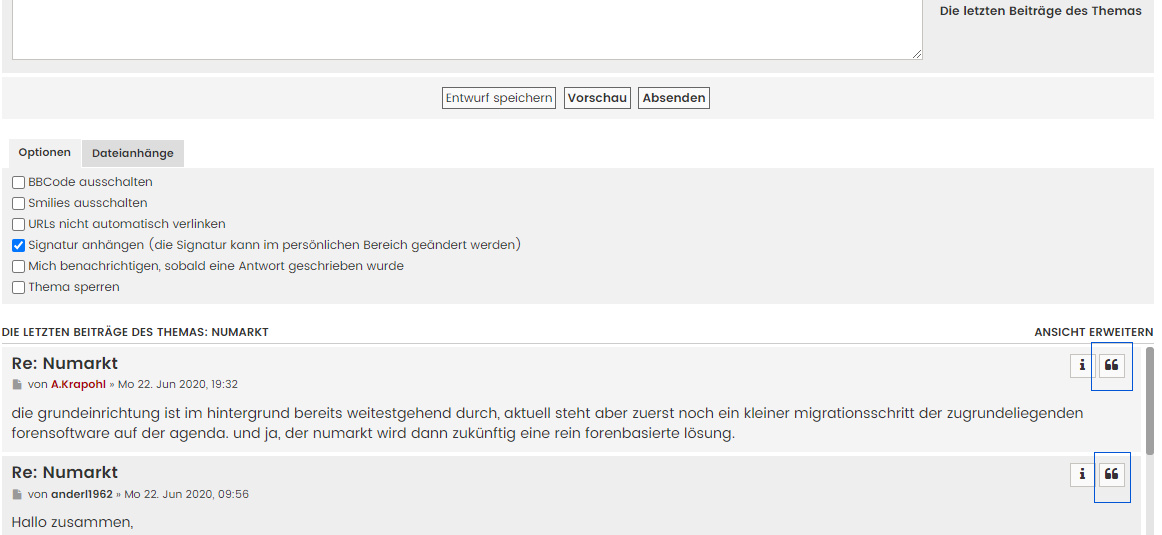 Mit einem Klick auf „Neues Thema“ links oben in der Forenübersicht kann man einen neuen Thread eröffnen. Will man auf einen bestehenden Thread antworten, gelangt man über die Schaltfläche „Antworten“ links unter dem betreffenden Thread zum Editorfenster. Aufgrund der flachen Hierarchie des Forums ist es nicht möglich, seine Antwort direkt an einen bestimmten Beitrag zu hängen. Neue Beiträge werden immer ans Ende eines bestehenden Threads angefügt. Mithilfe der Zitatfunktion lassen sich Aussagen aber eindeutig zuordnen – dazu später mehr.