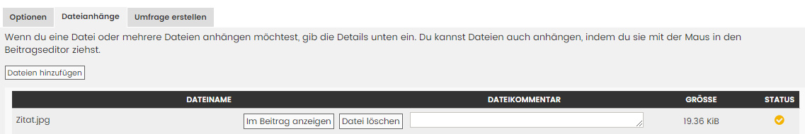 Eine ebenfalls recht häufig genutzte Funktion sind Dateianhänge. Sie dienen vor allem für Bilder-Uploads ins nuForum. Damit man ein Bild in einem Beitrag verwenden kann, muss man es nicht nur im Menü Dateianhänge hinzufügen (es lassen sich auch mehrere Files gleichzeitig auswählen), sondern muss es anschließend auch über den Button "Im Beitrag anzeigen" in das Thema einbinden. Dabei wird der Code an der Stelle eingebunden, an der sich der Cursor befindet. Die Fotos lassen sich genauso kopieren, ausschneiden und verschieben wie andere BBCode-Elemente auch.