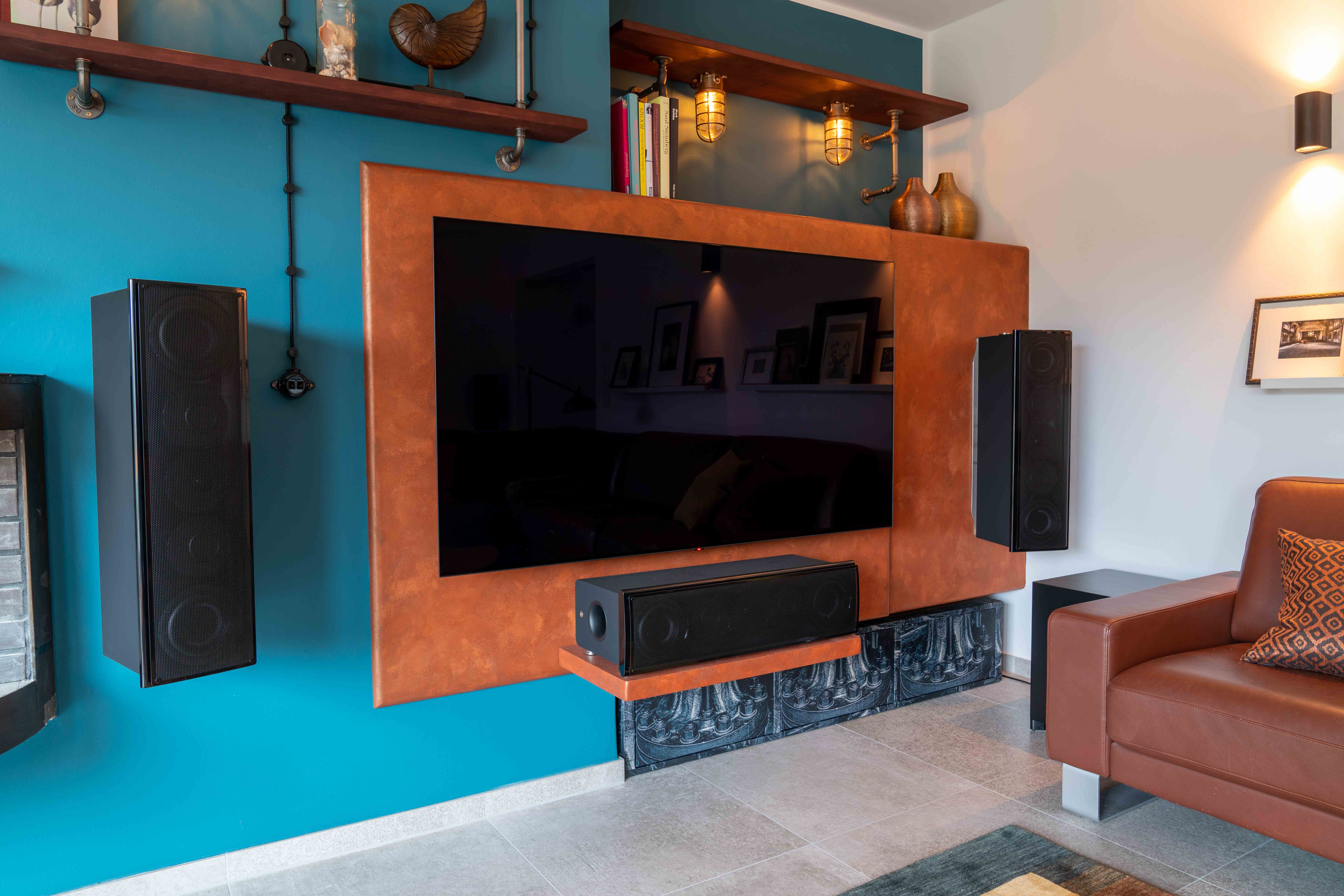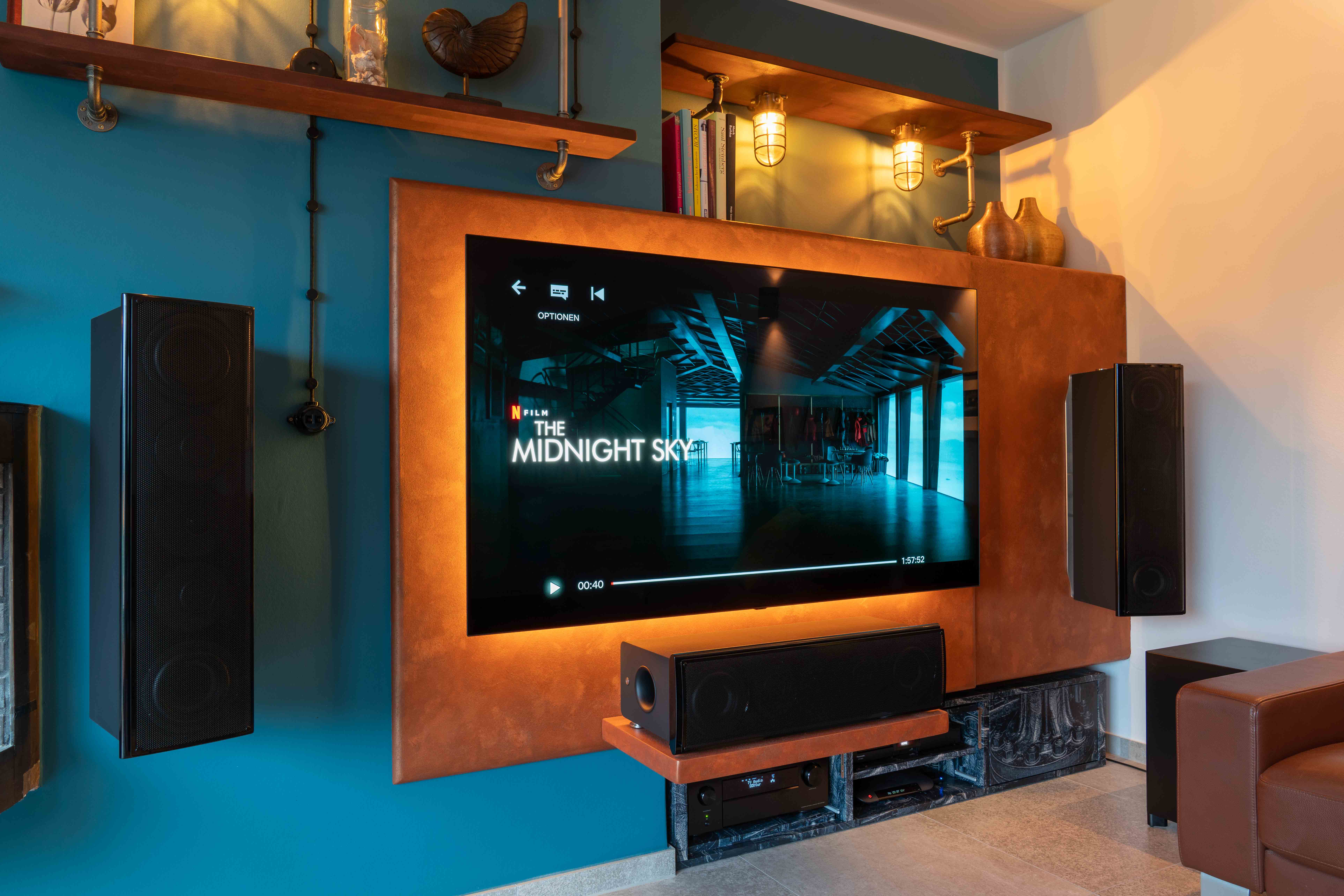 ) für die große Variante mit 3x nV70 vorn, 2x nV 50 seitlich/hinten und 1x nuSub XW-900 entschieden. Die beiden Front-LS wurden nun doch mit den original Nubert-Wandaufhängungen angebracht (die zwischenzeitlich mal angedachte DiY-Variante mit Halbzoll-Wasserrohren erschien mir angesichts der 19 kg Boxengewicht doch als zu riskant). Der Center ruht auf einem Sperrholzplatte, die wiederum mit sehr stabilen Edelstahlwinkeln an die Wand unterhalb des TV geschraubt wurde.