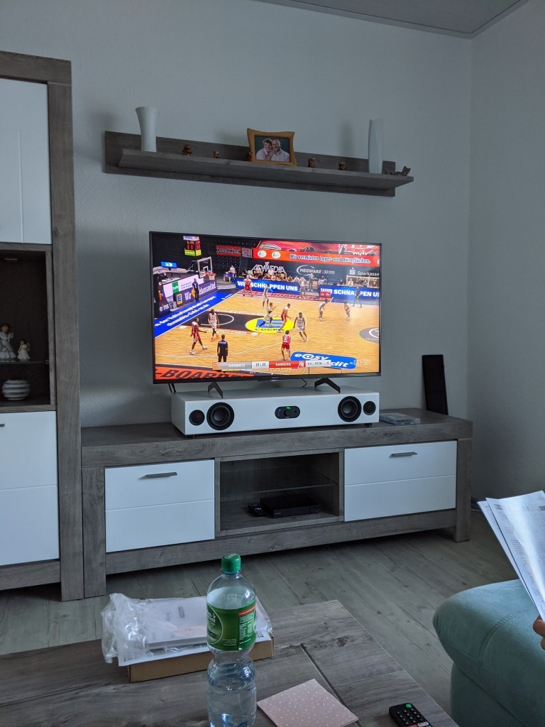 Nach ein bischen wetterbedingter Wartezeit haben wir heute die Soundbar bei der Schwiegermutter aufgebaut. Darauf steht ein neuer 49" SonyTV (KD-59XH8505) angeschlossen per HDMI-eARC. Das war gar nicht so einfach, in der 50" Klasse ein Modell ohne Standfüße an den Außenkanten zu finden. Die Verarbeitung war makellos. Die Fernbedienung hat den Namen endlich verdient und fühlt sich wertig an.