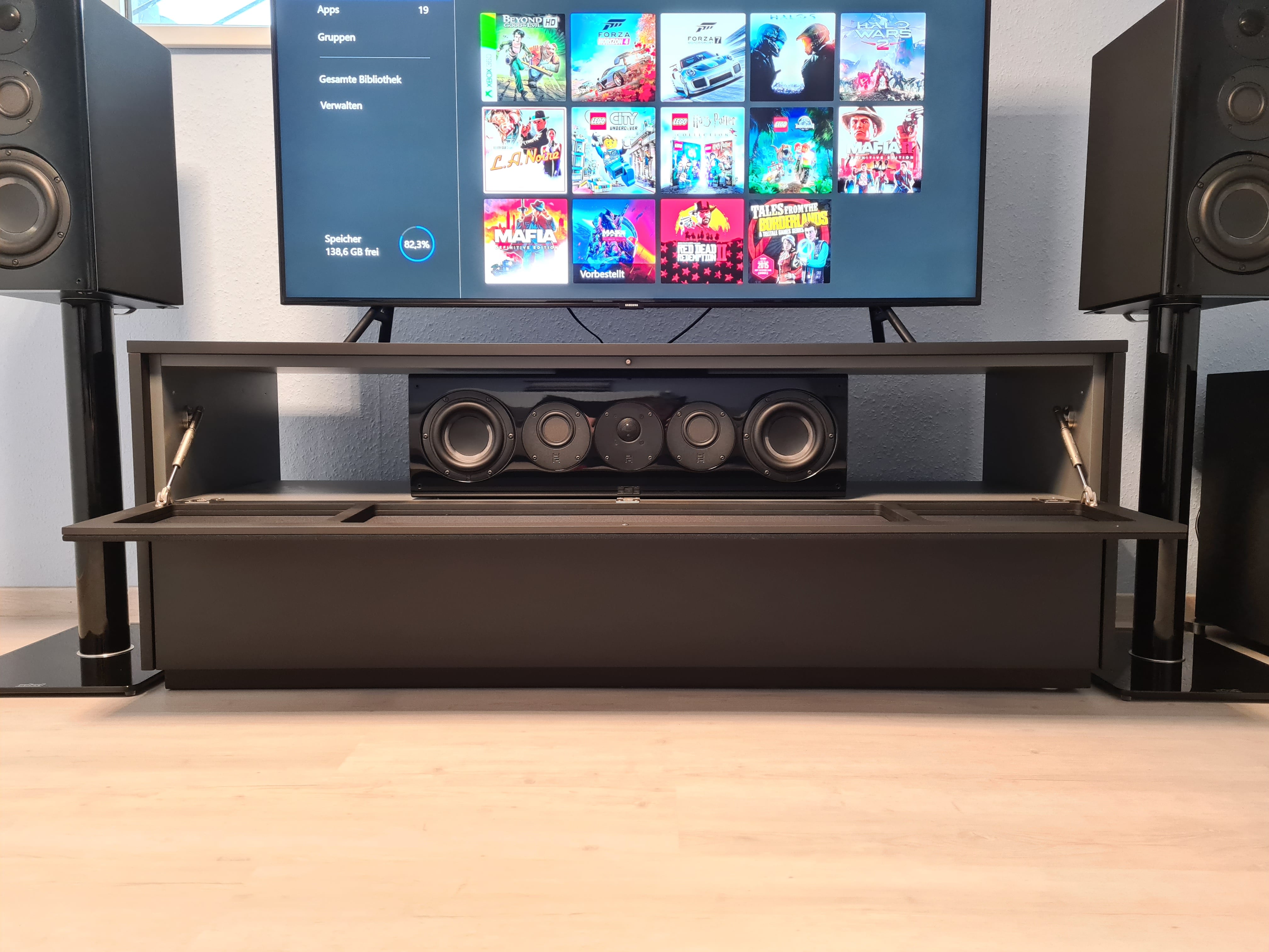 Bei dem Upgrade wollte ich meine aus dem nuBox-Set gewonnene Erfahrung anwenden. War ich damals noch der Meinung, die Frontlautsprecher seien die wichtigsten Lautsprecher im Heimkino, so sehe ich heute ganz klar den Center an dieser Stelle. So habe ich dann auch mit der nuVero 70 den Anfang gemacht. Neben der wirklich fantastischen Optik setzt er sich vor allem durch eine deutlich detaillierte Wiedergabe und gleichzeitig einem harmonischeren Hochton bei hohen Lautstärken von dem CS-413 ab. Bei mir steht die nuVero 70 im oberen Abteil des Lowboards, hinter der akustisch durchlässigen Bespannung. Leider bekommt man so von der tollen Optik nichts mehr mit, aber dem Klang tut es keinen Abbruch.