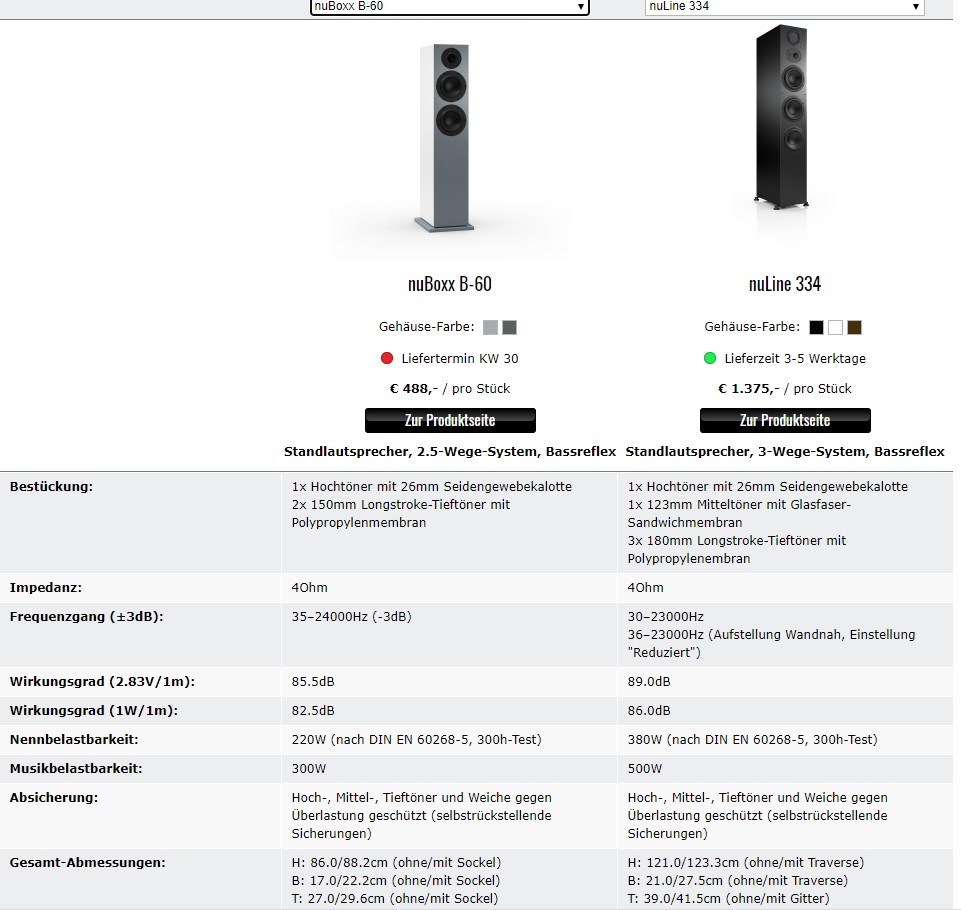 Noch was Anderes: Ich habe mir gerade die NL 284 und B-70 im Produktvergleich anzeigen lassen. Die Angabe "Wirkungsgrad (2.83 V/1m):" taucht dann zweimal in der Tabelle auf, einmal oben (gefüllt mit dem Wert der NL 284) und noch einmal ganz unten mit dem Wert der B-70. Der Wert der Vergleichsbox ist jeweils leer. Liegt vermutlich am Leerzeichen zwichen 2.83 und Volt (einmal ist es da, einmal fehlt es).