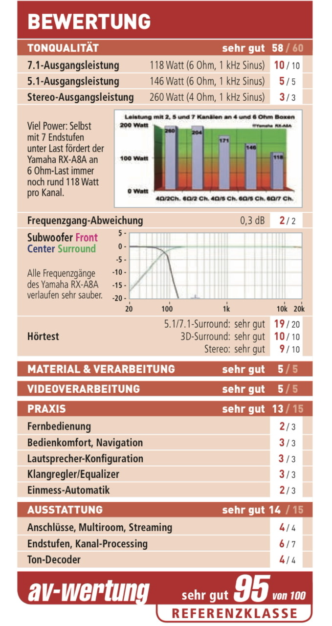 Der ebenfalls getestete Denon AVC-X8500HA kommt auf 97 Punkte. Die Endstufenleistung liegt bei beiden Geräten recht nah beieinander.