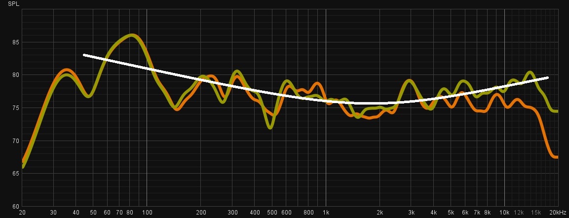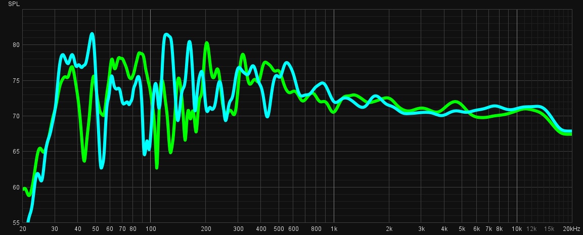 zur Illustration der Abstimmung der nuBoxx habe ich noch eine Messung des Frequenzgangs mit voll zum Hörplatz eingedrehten Lautsprechern gegenübergestellt (gelbgrün, ohne jeglichen EQ Eingriff)