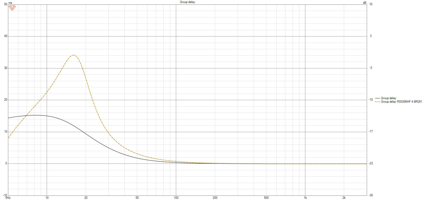 Um die frequenzabhängigen Unterschiede zwischen BR- und CB-Sub besser darstellen zu können, wird statt der Impuls- oder Sprungantwort, die Gruppenlaufzeit (GD) der Subs verglichen (diese kann auch aus der Impulsantwort abgeleitet werden, negative Ableitung des Phasenfrequenzgang). Die GD zeigt die zeitliche Verzögerung der Hüllkurve des Trägersignal bei verschiedenen Frequenzen. Man kann schön sehen, dass das GD um die Resonanzfrequenz des BR-Sub (gestrichelte Linie) fast dreimal so lang ist, wie das des CB-Sub mit LT.