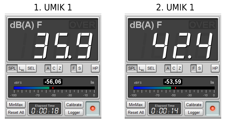 Dann REW geschlossen, 2. UMIK angeschlossen, Kalibrationsdatei (90°) ausgewählt, SPL Meter geöffnet (steht immer noch auf 'fast' und A-weighted): 45dB(A). Für mich sieht das so aus als ist die Kalibrierung von einem der Mikros inkorrekt.