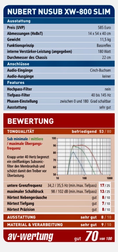 Im Prinzip werden nur die vergleichsweise niedrige Grenzfrequenz und Maximalpegel bemängelt, welche halt einfach der flachen und kompakten Bauweise Tribut zollen.Zweck0r hat geschrieben: Fr 5. Aug 2022, 20:51 Gibts da auch irgendwelche stichhaltigen Begründungen für die "nur 70 Punkte" ?
