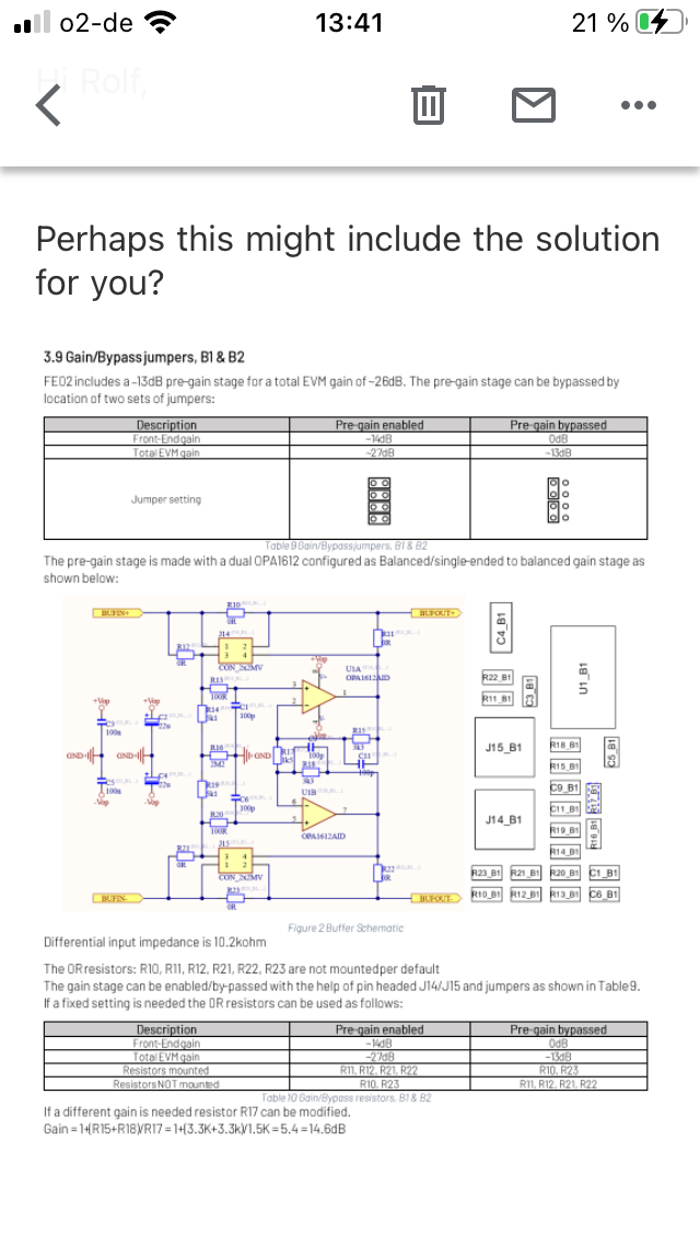 Interessant war noch der Gain der Purifi. Viel zu gering. Niemals wie vom Händler auf Anfrage angegegeben 25,8. Also support kontaktiert, wo das Problem liegen könnte. Support grundsätzlich auf Englisch. Man kann auf Deutsch anfragen, aber die Antwort kommt immer in Englisch. Antwortzeit jeweils wenige Stunden. Die Antwort war