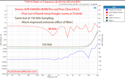 Keine Ahnung, ob das hier schon angesprochen wurde, aber falls möglich, sollte man den Denon auf die maximale Abtastrate stellen. bei 44,1-48 Khz gibt es ein Problem im Filter. Bei 192 Khz sieht alles ganz okay aus. Auch der subjektive Unterschied war definitiv spürbar.