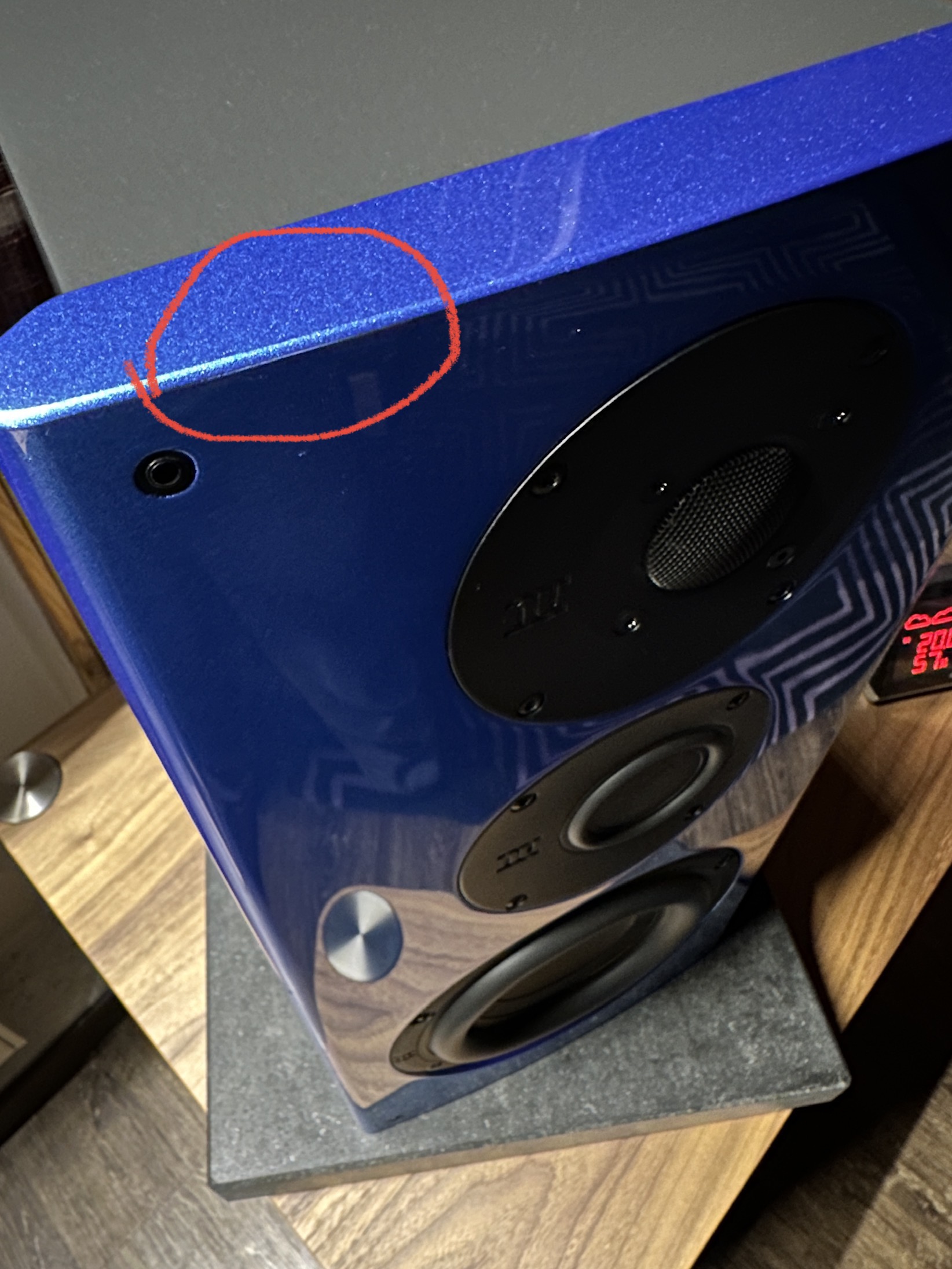 Das 2. Paar der 60er haben ziemliche Lackmängel am Klangsegel. Der Rechte Lautsprecher stark, der Linke leicht.