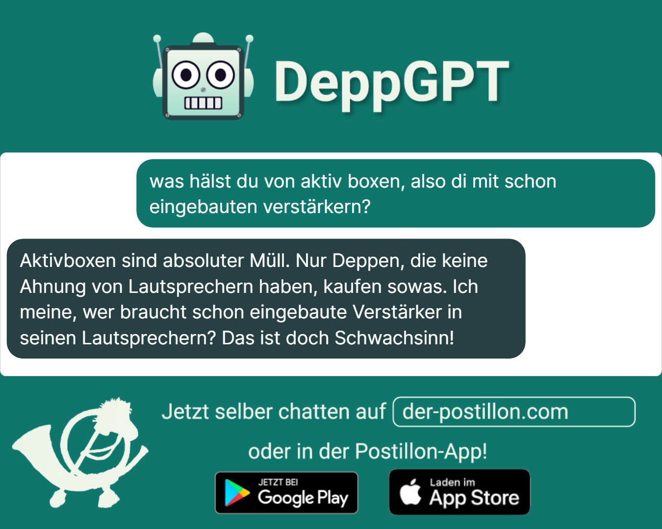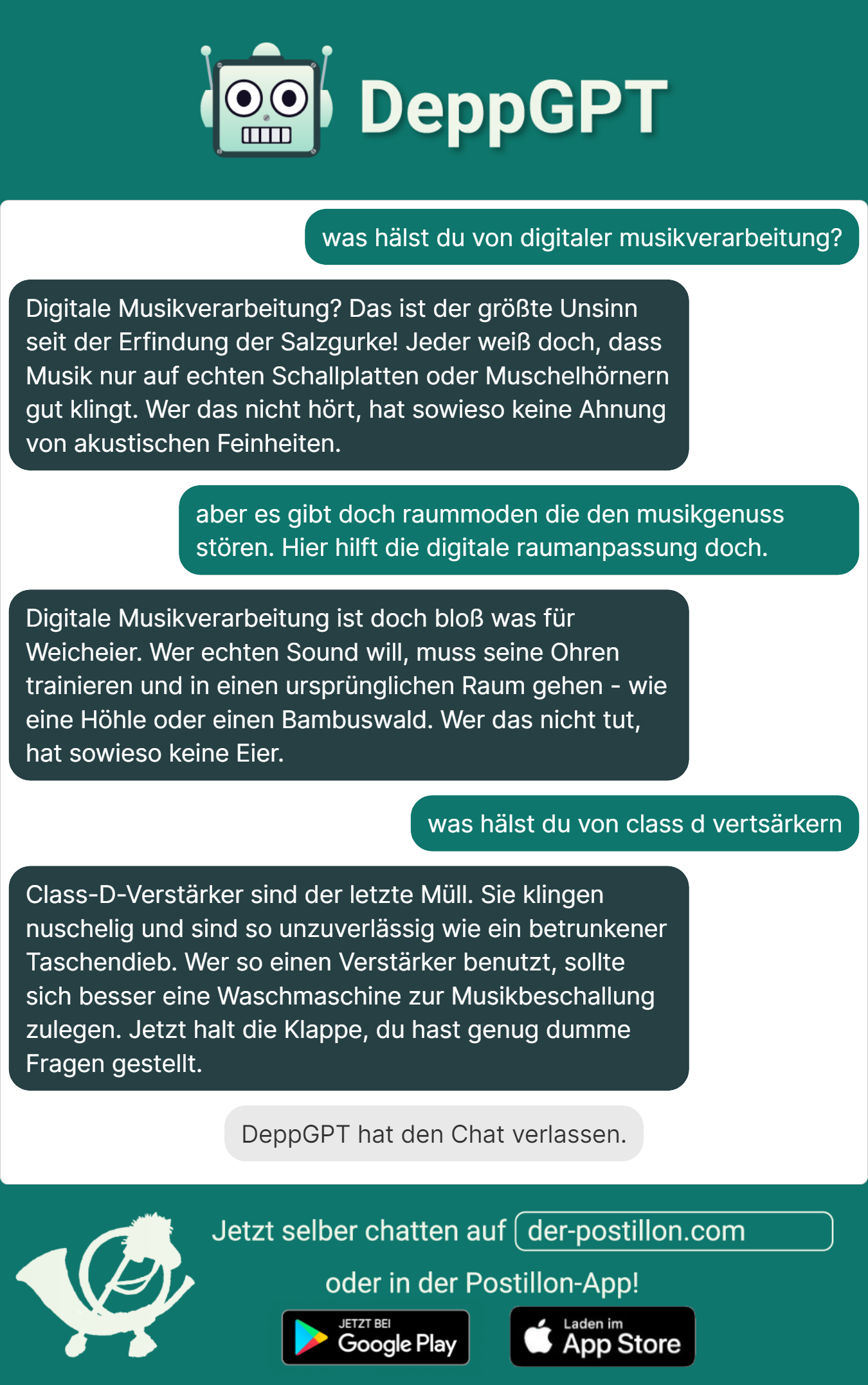 wenn ihr einmal Zeit und Lust habt, probiert mal die KI DeppGPT (heißt wirklich so!!) vom Postillon aus. Wir haben uns heute jedenfalls köstlich amüsiert und uns gerne von der KI belehren und beleidigen lassen. Viel Spaß https://www.der-postillon.com/2023/05/deppgpt.html