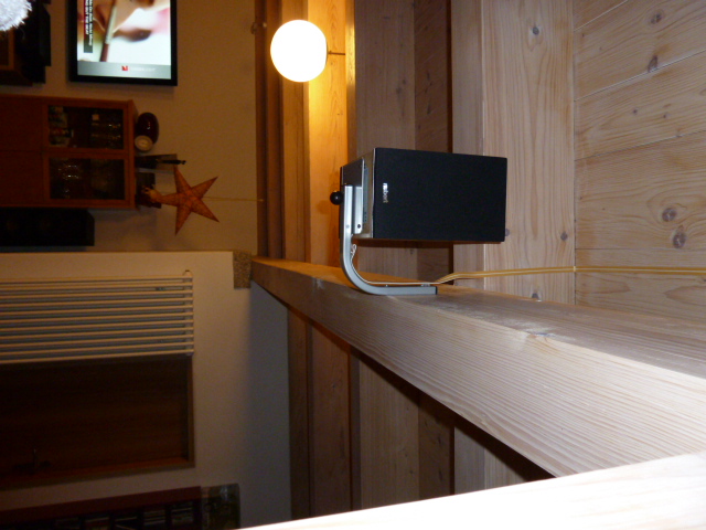 an der Holzdecke ließen sich die Boxen (quer!) mit einer Losen Rolle nahezu unsichtbar hinter den Deckenbalken verstecken und zum Gebrauch herunterlassen.