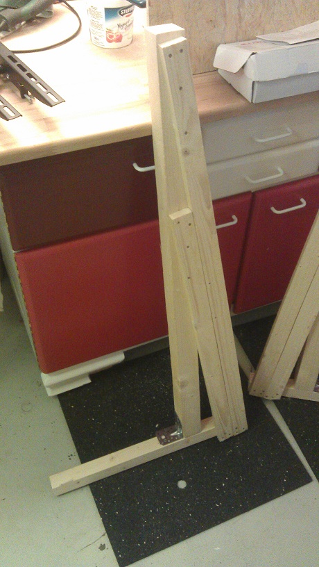 Ich stelle mir ein drei Holzgestelle vor welche ein Brett geschraubt wird, an welches der TV mit einer normalen Wandhalterung gehängt wird. Die Gestelle sind 1,19 m hoch (wie die Lautsprecher) und haben bei einen etwa 50 cm langen Fuß.