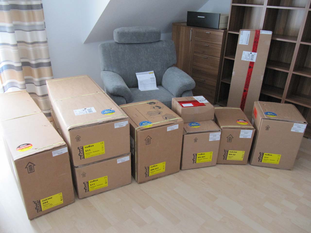 So fuhr also die Tage kurz nach Mittag ein UPS-Transporter vor und bescherte mich mit ganzen neun NuPäckles. Für drei der großen Kisten musste ich mir Hilfe beim Treppe hochtragen besorgen, ist aber schließlich alles in der Wohnung angekommen.