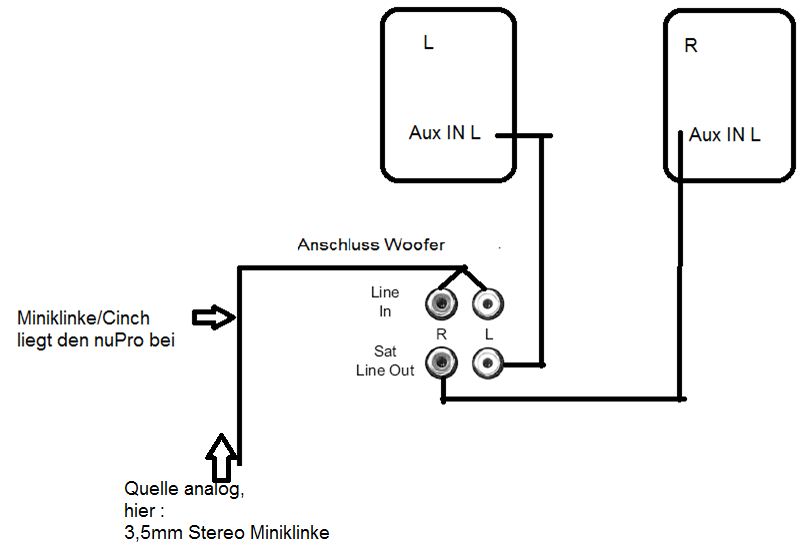 Von Quelle per Cinchkabel an Subwoofer "Main IN". Anschluss der NuPros ebenfalls per Cinchkabel von "Main OUT" an "AUX in" der Nupros. Gegebenenfalls braucht Du vom PC zum Subwoofer auch ein solches Kabel:Klinke auf Cinch. Hängt von Deiner Soundkarte ab.