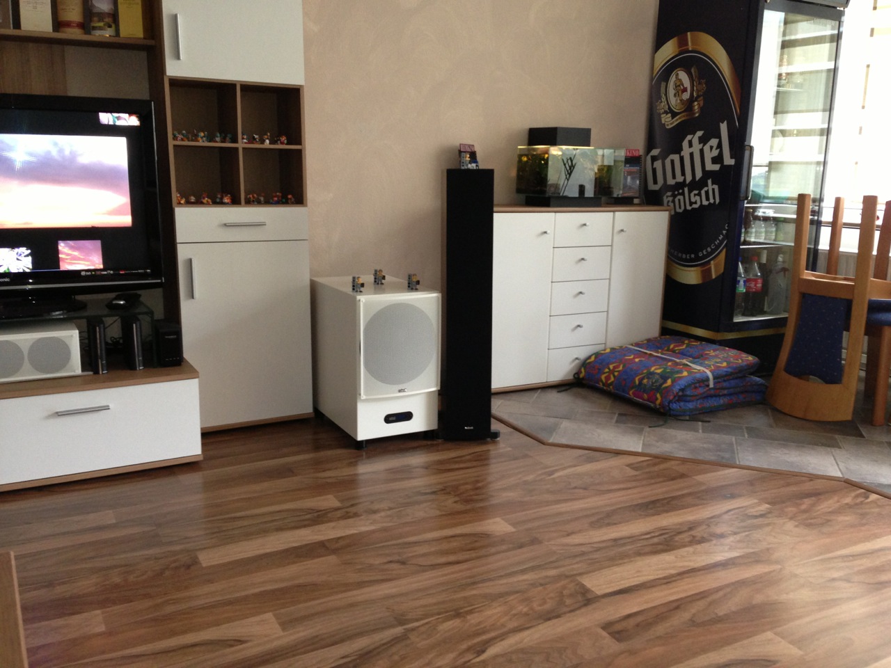 - Zwischen Boxen und Hörposition viel schallharte Flächen (glatter Boden, Glastisch)