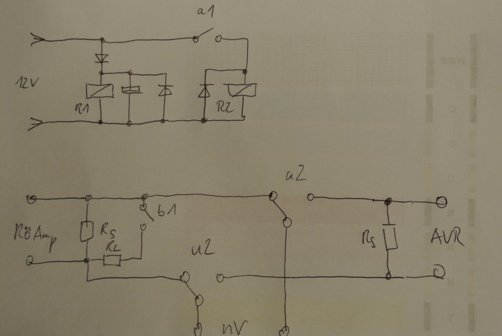 Tja, dann bräuchtest du schon jemanden, der sich damit auskennt. Es braucht nur zwei solide Relais, eines für die Umschaltung zwischen den beiden Verstärkern, eines für die Zuschaltung der Lastwiderstände für den Röhrenverstärker, dazu zwei sogenannte Freilaufdioden, eine Sperrdiode, einen Ladeelko mit einem kleinen Ladewiderstand. Das ganze entsprechend verschaltet, siehe Skizze, für deren mäßige Qualität ich mich unter Verweis auf die vorgerückte Stunde und die hier immer noch sehr hohen Temperaturen entschuldigen möchte (ich hab 29 Grad im Wohnzimmer und das Notebook brennt sich quasi durch die Hose).