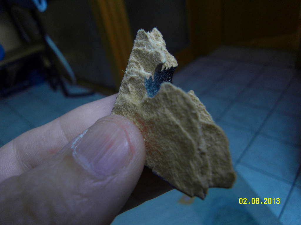 Hier ein Bild vom abgeplatzten Teil. Die einzelnen sichtbaren Fasern sind nicht steif, sondern wie Pappe biegbar. Ich bin aber kein Schreiner und kann dies nicht wirklich beurteilen. Wenn ich aber leicht an den Fasern reiße (Bild 1), lösen diese sich auch leicht. Es sieht nach Pappe aus und fühlt sich auch so an. Wenn dies eine MDF-Platte ist, dann sorry, dann ist es eben eine MDF-Platte. Relativ weich ist dieses Teil trotzdem. Und auf die Kante würde ich ihn nicht stellen wollen.