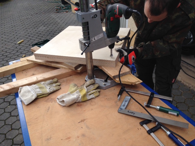 . Löcher 20mm Löcher in die Mulitplexplatten. Hier gab es 2 Problem. Trotz akribischen rechnen und anzeichen bis aufs Atom genau, waren die Löcher am Ende teilweise 1-2 mm verschoben. Darauf kam ein neues Problem auf, daß sich das ganze Konstrukt bei einem Testaufbau verkeilt hatte.