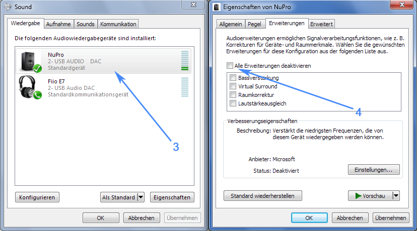 Rechts unten in der Taskleiste klickt ihr mit der rechten Maustaste auf das Lautsprechersymbol und öffnet das Fenster "Wiedergabegeräte". Hier macht ihr einen Doppelklick auf die NuPro(3) und geht zum Tab "Erweiterungen". Es ist wichtig, dass kein Haken bei "Alle Erweiterungen deaktivieren"(4) zu sehen ist, da dass EQ APO eine Erweiterung ist.