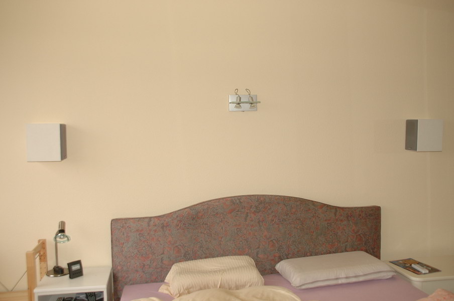 Bei meiner Schlafzimmeranlage habe ich die Rears in 1,25m Höhe (bis zur Unterkante Box) angebacht. Da es sich hierbei noch um alte nL Dipole handelt, konnte ich direkt an der Wand anbringen. Selbst im Aufrechtsitzen im Bett sind sie so oberhalb meines Kopfes.