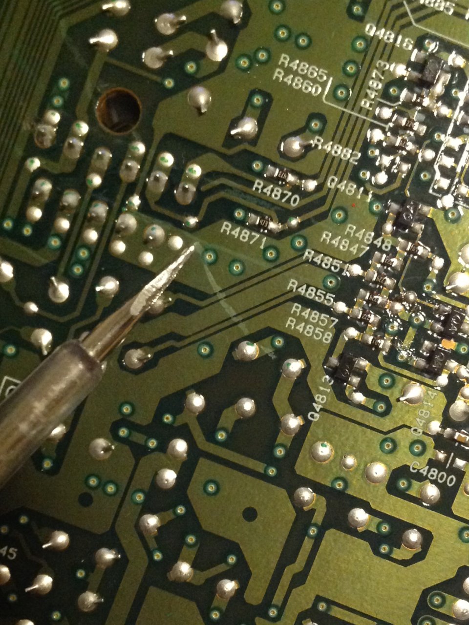 Dazu habe ich meiner künstlerischen Fähigkeit freien Lauf gelassen, Bild hängt an. Weiter gehts: Ich muss Masse/GND der Main-In-Buchsen mit der Masse der Pre-Outs verbinden. Die Fläche R4871 habe ich gefunden, aber welchen Punkt kann ich zum Verbinden verwenden? Rechts oder links neben dem Schraubendreher? Dazu auch ein Bild im Anhang.