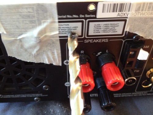 Viel Platz ist für den Einbau von Chinchsteckern nicht - zumal der obere Deckel einen Teil der Höhe hinten durch eine Nut weg nimmt. Das muss man beim setzen der Bohrlöcher berücksichtigen sonst liegen die Buchsen zu hoch ! Ich habe mich trotz des höheren Aufwandes für den Einbau von 4 zusätzlichen Chinchbuchsen entschieden - gekauft bei Conrad zu 2,85 das Stück ( Isolioert ). Die Positionen musste ich so wie auf dem Bild zu sehen ist auswählen - es gibt kaum Optionen, es sei denn man nimmt das ganze Gehäuse auseinander - was ich nicht wollte. Metallbohrer 6mm zum vorbohren - danach aufgebohrt auf 9 mm damit die Buchse keinen Kontakt zum Gehäuse hat.