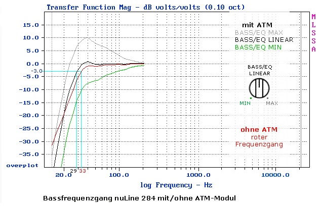 ...aber für mich ist nur bei Bassregler auf MAX ein -3dB-Punkt von ~22/23Hz ablesbar (bei LINEAR halt die angegebenen 29Hz und bei MIN dann nur noch ~100Hz)Langerr1 hat geschrieben:Die untere elektrische Grenzfrequenz (- 3 dB)des ATMs 284 kann auch aus der Grafik abgelesen werden und liegt bei ca. 18 Hertz.