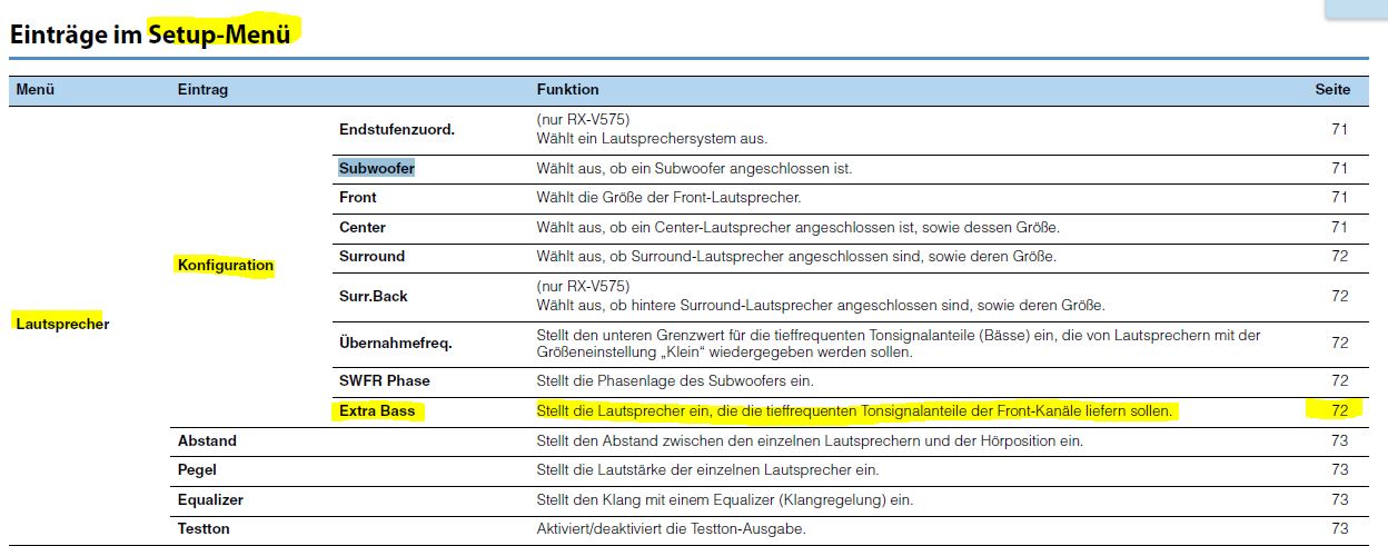 Und ich tippe mal, dass die 383 recht wandnah steht und der 475 sie daher als large eingestuft hat. Weshalb dann bei Musik kein Sub anspringt.Fly hat geschrieben:ich tippe mal dass die Yamaha-Einstellung SW-Mode: EXTRABass nicht aktiviert ist