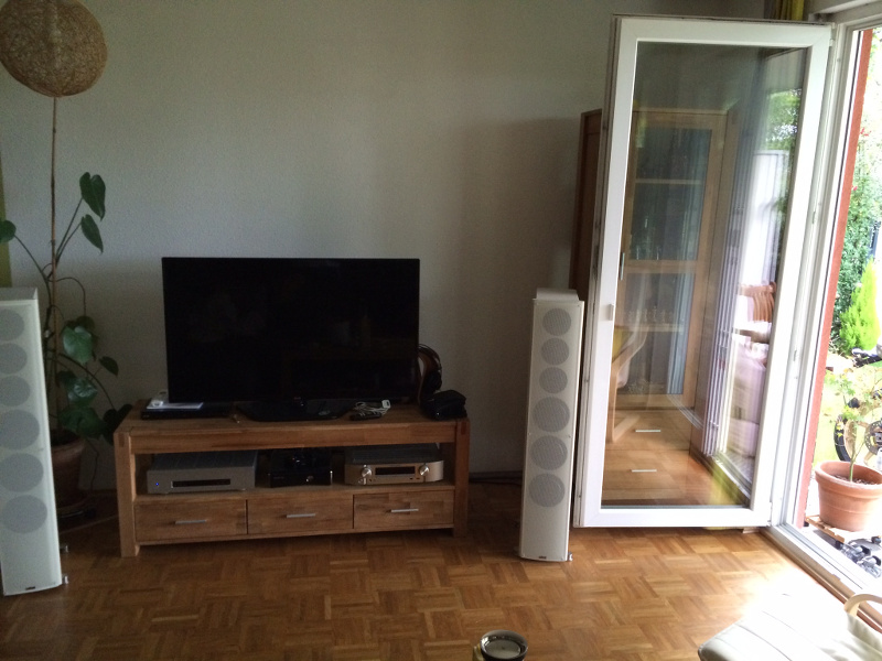 Nun habe ich wie schon hier oft genannt das Problem mit der wandnahen Aufstellung beider Lautsprecher und der rechte steht zusätlich noch in der Ecke. Der Wandabstand ergibt sich je nach Lautsprechertiefe auf ca. 20cm, dies ist der Terrassentür geschuldet welche natürlich nicht zugestellt werden soll und damit nicht mehr geöffnet werden kann. Die Lautsprecher hätten einen Abstand von ca 2,8m zueinander und etwa 3,25m zur Hörerposition.