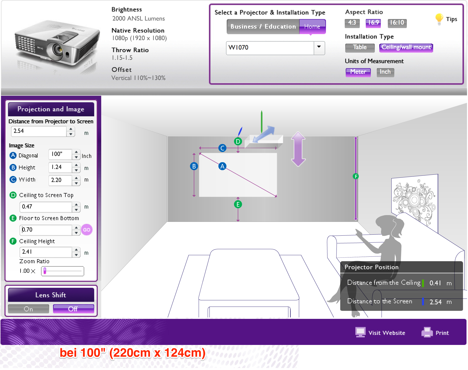 Leider stoße ich gerade beim Benq Calculator bei einer Diagonale von 133" an die räumlichen Grenzen.