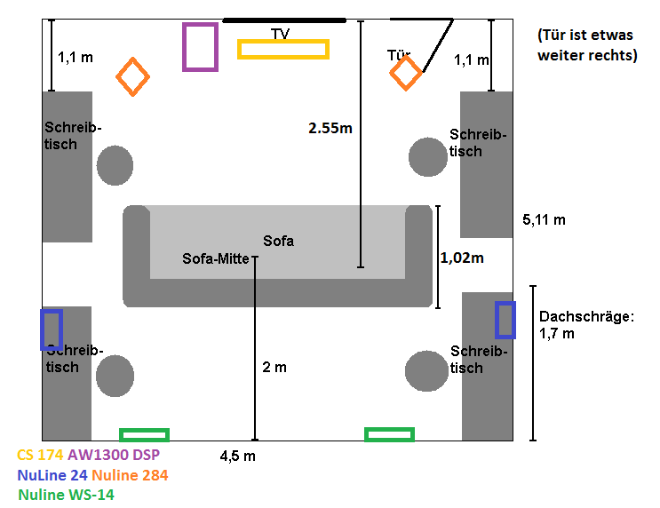 Sie soll aber 2x im 7.1 als hintere Box hinter der TV-Couch zum Einsatz kommen. Dazu muss sie ja leicht auf die mittlere Hörposition eingeschwenkt werden, damit sie nicht ganz so flach an der Wand ist wie in dieser Zeichnung, sondern eher so wie die Frontboxen leicht eingewinkelt: Sitzfläche auf der Couch sind 194cm.