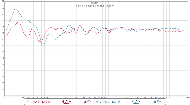 Ergebiss: Sprachverständlichkeit wesentlich besser! Raummode bei 34 Hz nicht mehr so angeregt. Kein Basswummern! Die Höhen nerven nicht mehr! Mehr Details hörbar! Die Verbesserung von der guten Stimmwiedergabe ist nicht nur auf die Einmessung und der Umstellung von den Mains zurückzuführen. Hier haben porösen Absorber an den Wänden auch noch deutlich mitgeholfen.