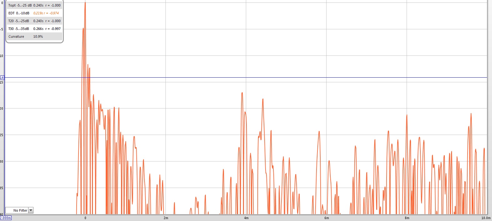 Angehaengt habe ich Panorama vom Raum, dann Absorber Positionen markiert, einen Frequenzverlauf 1/6 smoothing, eine Impulsantwort, sowie einen Decayverlauf.