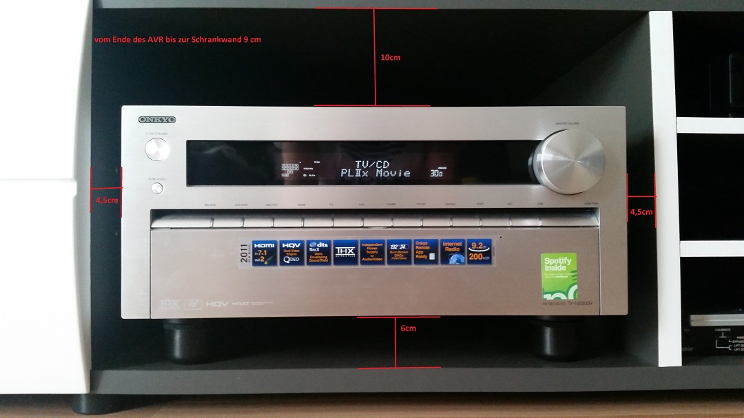 Bin mir da nicht sicher da hinter dem AVR nur 2 Öffnungen von ca 6cm Durchmesser sind da liegen in beiden Löchern die Kabel durch. Dahinter gleich mit ca 5cm die Betonwand... Schrank vorrücken geht auch nicht....