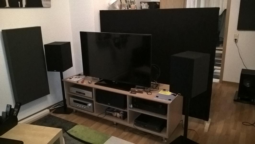 kannst du das frontsetup noch ein wenig nach rechts rücken? ansonsten sehe ich da gar keinen raum für eine standbox, und die 383 fühlt isch da insbesondere an der linken seite auch nicht so wohl (d.h. 30 cm nach links könnte das ganze schon mal besser klingen lassen)