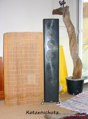 Wenn alles nichts hilft, das Schutzgitter unter Strom setzen (max 1mA bei Katzen) oder einen Maschendrahtzaun drum herum bauen. Oder man wartet, bis Nubert eine Lösung rausbringt: Den "nuBull", einen zertifizierten Pitbull, der die Boxen bewacht und die Katzen auf Abstand hält. Vielleicht kann man sowas aber auch elektronisch bauen: Einen von diesen selbstgesteuerten Staubsauern umbauen, mit Video und Signalverarbeitung ausstatten und mit einem cat-matcher prägen, der sich bei Annäherung des Tiers zwischen Katze und Box schiebt.