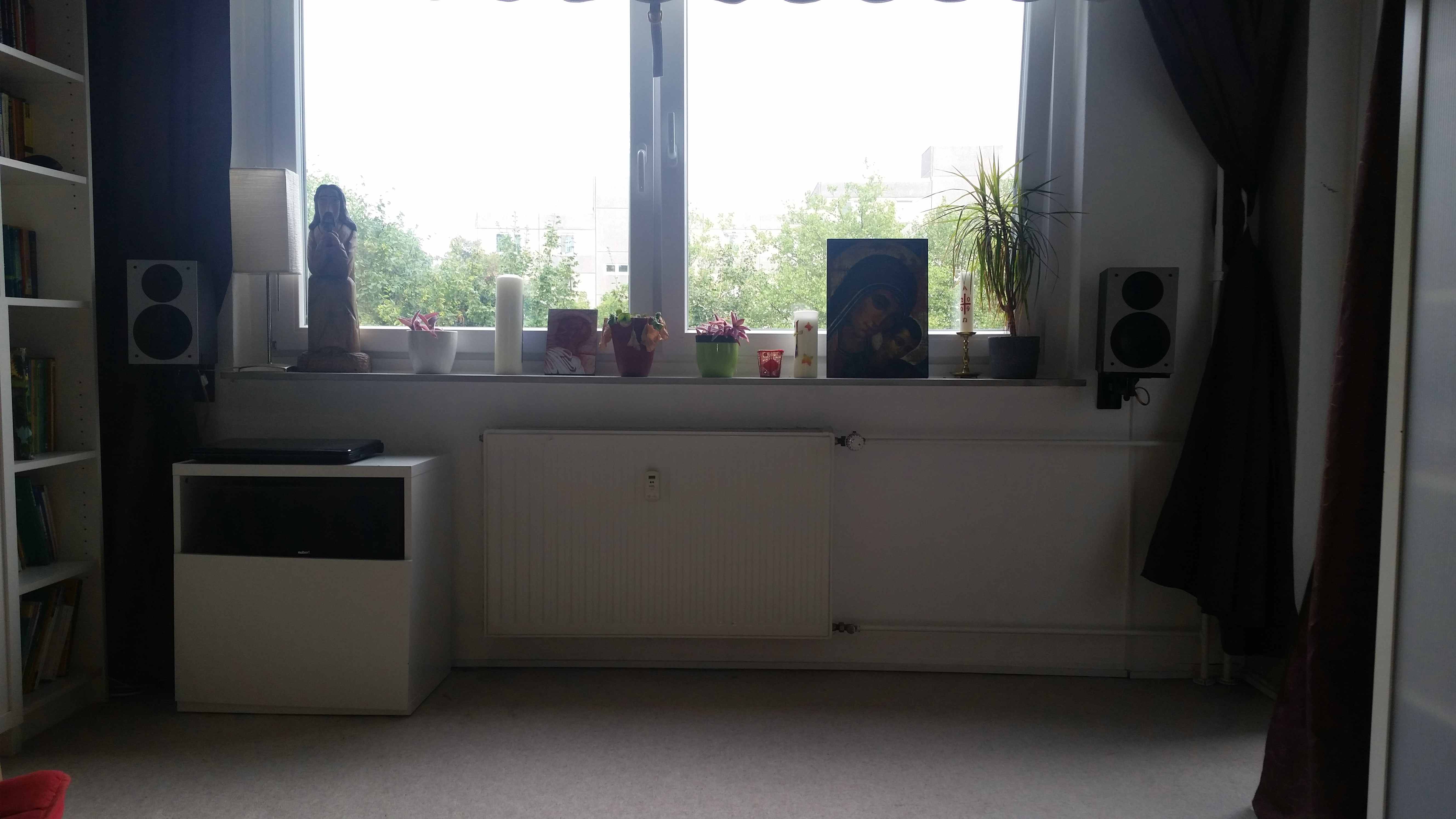 Wie man sehen kann ist die Tür im weg also da hinter anbringen ist leider nicht, daneben auch nicht weil dann die Leinwand den Lautsprecher wieder überdecken würde.