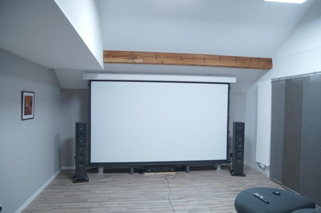Leider muss der Center am Boden bleiben da die Leinwand so weit herunter fährt und nicht aus Akustik Stoff besteht. Hat sich bei Zahlreichen Tests aber
