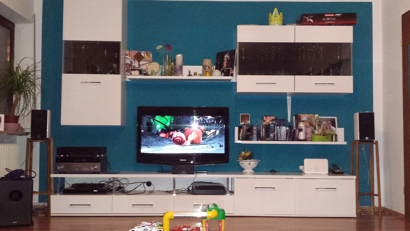 Nun, wir haben zusammen das Wohnzimmer eingerichtet und für die Möbel etc. ein Haufen Geld hingeblättert. Da es Aufgrund von Fenster, Türen und eine Essniesche keine besseren Stellmöglichkeiten gibt. Ist die Wahl so gefallen. Nun kann man erst was ändern, wenn die Möbel ausgetauscht werden (sind aber erst 1 Jahr alt). Da wir auch 3 Kinder haben, braucth man halt auch Platz - Stauraum. Also mit der Einrichtung geh ich hier mit dem WAF gleich