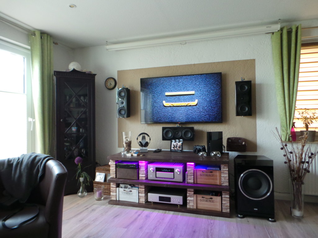 Sieht doch gut aus mit den 50 er u. 5 er an der Wand. Wie machst du das mit der Leinwand, sind die Boxen nicht dahinter?