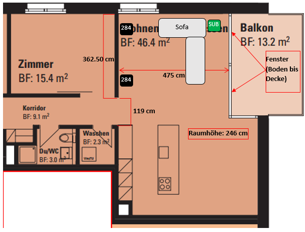 Der Subwoofer steht nun hinter dem Sofa (im angehängten Bild in grün), da er in der Front leider nur direkt neben Nuberts platz hätte womit der Effekt wieder verfällt (vorne mittig würde nicht gehen). Für mich ist das Ergebnis aber ideal und genial. Für 5.1 passt dieses Setup auch super. In meinem Onkyo habe ich einfach Double Bass aktiviert, somit läuft der Subwoofer immer mit, aber auch die Nuberts