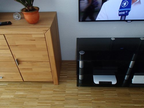 TV, Glasrack und Sideboard müssten so bleiben - lediglich der TV und das Glasrack könnten etwas nach rechts rutschen, damit mehr Platz zwischen linker A-500 und dem Sideboard wäre....