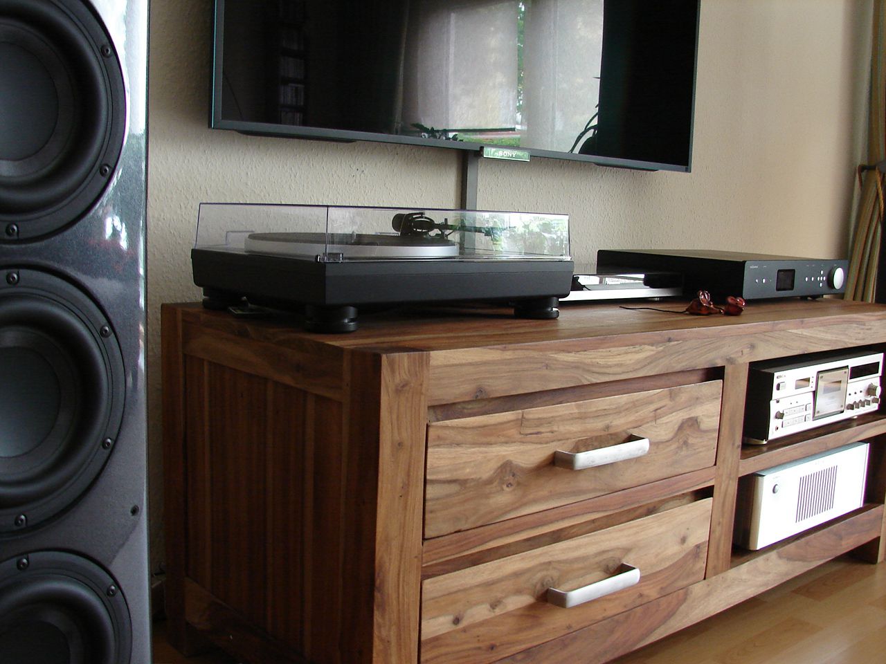 Dann kam er an seine Platz. Angeschlossen erst mal nur mit dem eingebauten Phono. Und das klingt schon verdammt noch mal gut