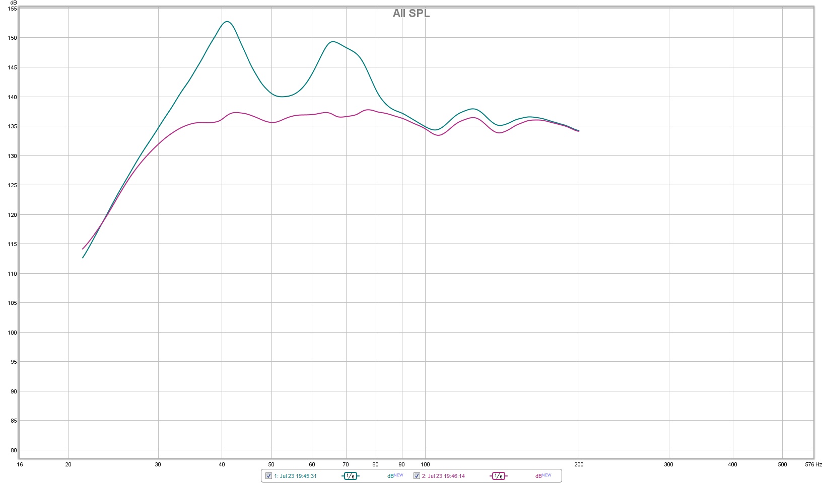 Zudem lassen sich Späße wie ein DSP zur Tieftonkorrektur sehr leicht einschleifen, wie Du an der Messung meiner A-500 sehen kannst (Vorher/Nachher):