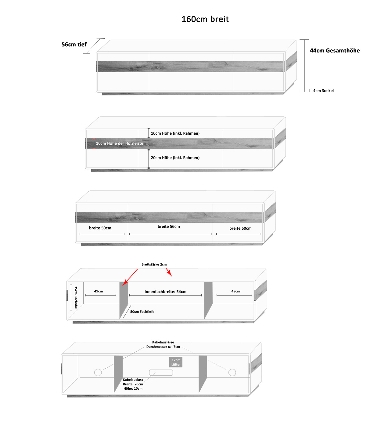 Wenn die Kabel nach hinten raus verlegt werden, könnte man ja die Außenwände und das obere Brett 5 cm tiefer designen als die Fächer plus Rückwand, so dass die Kabel komplett unsichtbar werden (man sähe sie nur, wenn man das Board von der Wand abrücken würde).